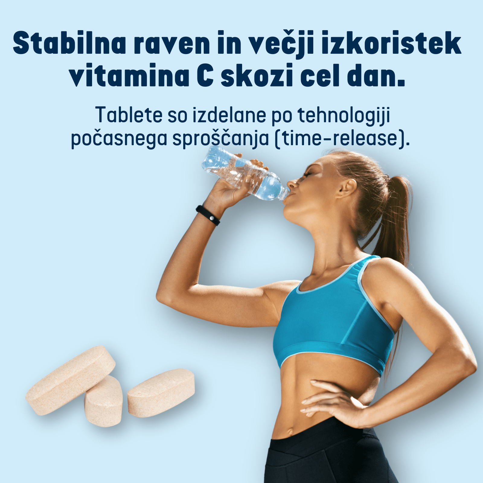 Da bi telo čim bolje izkoristilo zaužiti vitamin C in da bi njegov učinek trajal dlje časa, so tablete izdelane po tehnologiji počasnega sproščanja (time-release). To pomeni, da se vitamin C sprošča postopno skozi ves dan, kar omogoča stabilno raven v telesu in večji izkoristek z eno tableto na dan.